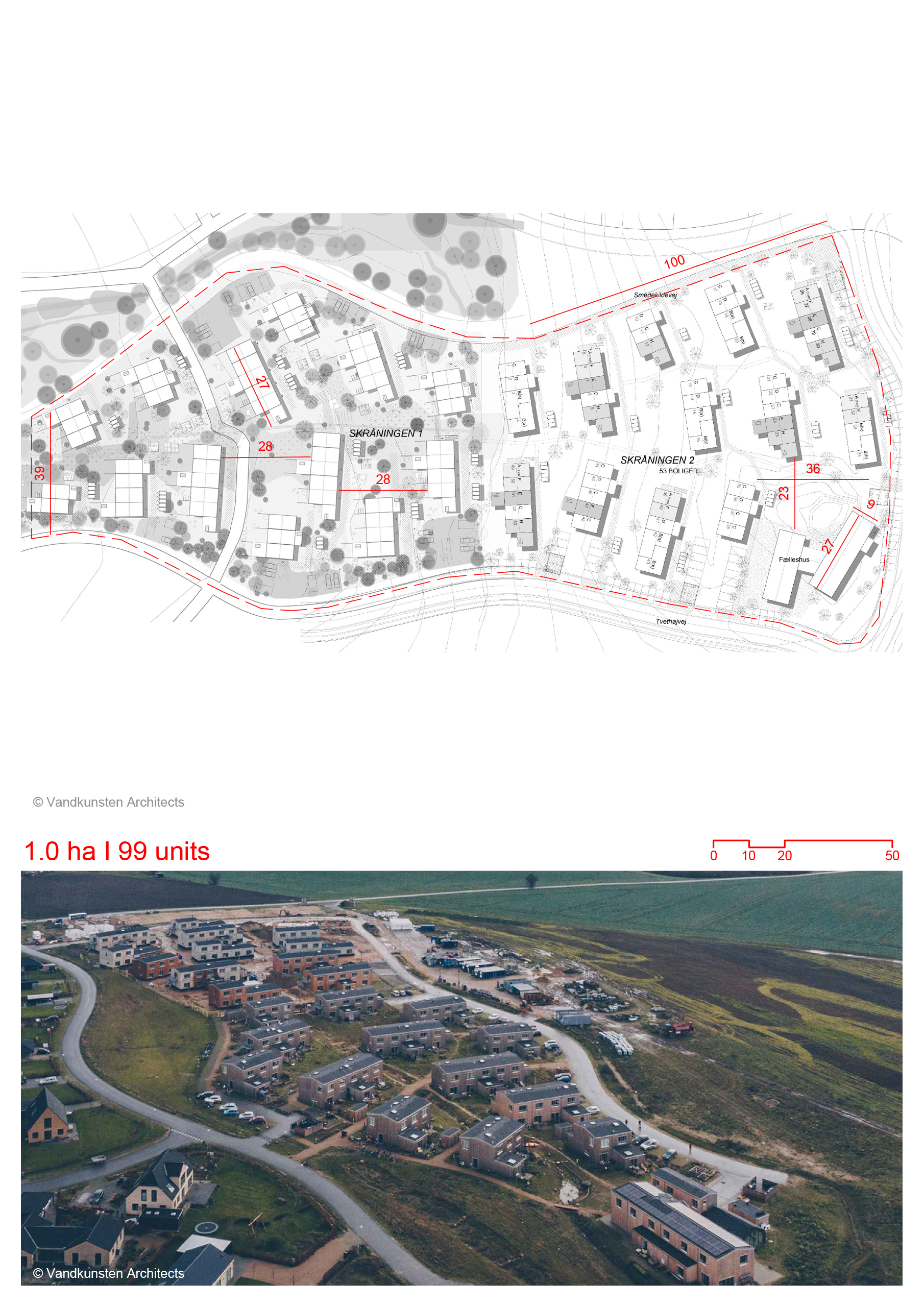 - Design's Vision: - Eco-Villages for residential communities in Denmark. - Focus on environmental respect in both construction and community living. - Special concept for community living. - Homes have direct access to an extensive landscape, forming the backbone of the development. - Building Material and Design: - Wood was chosen as the primary building material for economic box modules. - Homes are designed with a basic spatial module and various extra modules for diverse needs. - House depth of 7.5m to enhance brightness. - Modular design offers flexibility in home sizes. - House variety is used as an architectural tool for built-in diversity. - Represents a new generation of suburban housing – Swan-labelled, sustainable, and affordable. - Community Living Features: - Electric car-sharing scheme for residents. - Organic communal dining and shared kitchen gardens. - Scenic surroundings with a view over the river and Allerslev. - Sustainable Construction: - Homes are insulated with paper wool and have a heat pump as a heat source. - Wooden building with well-tested and sustainable materials. - Modular construction is produced in Denmark. Facade cladding made with profile boards in Thermowood.